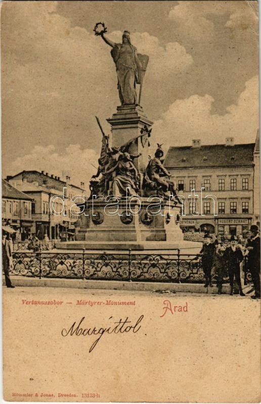 1901 Arad, Vértanú szobor, Hubert Bernát üzlete / Märtyrer-Monument / ... https://www.darabanth.com/de/409-Fernauktion/409.0/Ansichtskarten/Siebenburgen~1000006/1901-Arad-Vertanu-szobor-Hubert-Bernat-uzlete-Martyrer-Monument-martyrs-monument-shops-~II2535381