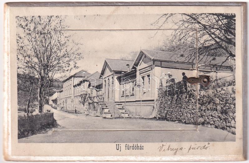 1908 Vihnye, Vihnyefürdő, Kúpele Vyhne; Új fürdőház. Kemény hátú leporello 12 képpel, Joerges A. özv. és fia 1907. / new spa building. Thick leporellocard with 12 images