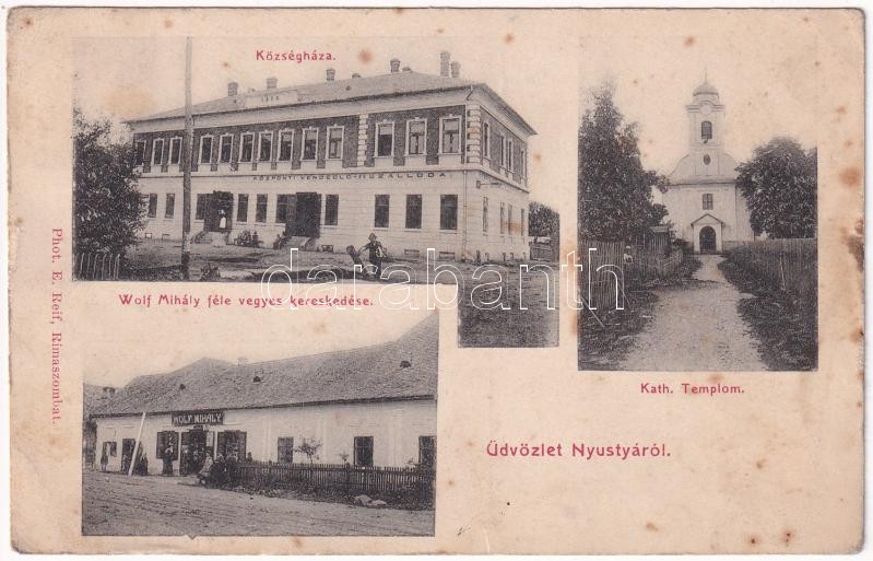 1910 Nyustya, Hnústa, Hnústi; Községháza, Központi vendéglő és szálloda, katolikus templom, Wolf Mihály féle vegyeskereskedés, üzlet. Phot. E. Reif / town hall, church, shop, restaurant and hotel (EK)