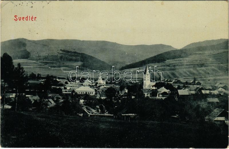 Beschreibung: 1913 Svedlér, Svedlár; látkép, templomok. W.L. Bp. 2718. Ifj. Langermann Mihály kiadása / general view, churches (EK)