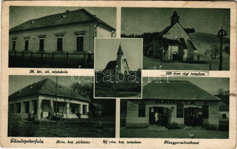 1943 Gömörpéterfala, Petrovce; M. kir. állami népiskola, Új római katolikus és a 800 éves régi templom, Római katolikus plébánia, Hangya szövetkezet / churches, school, parish, cooperative shop (EK)