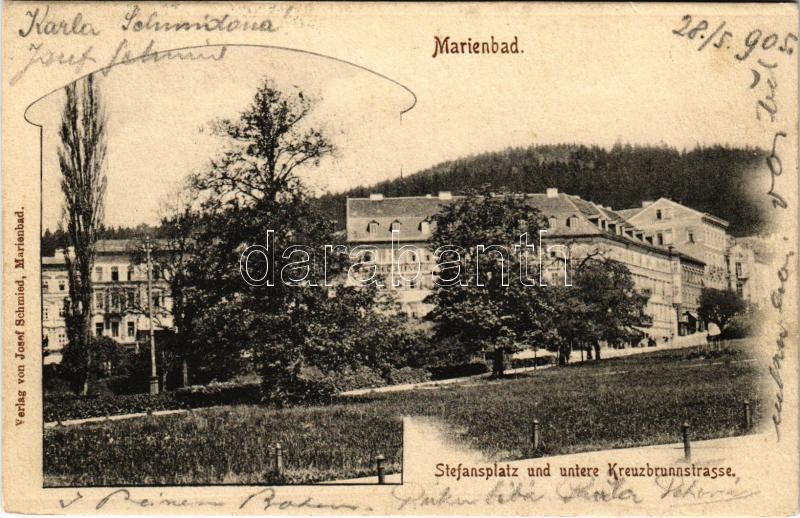 Beschreibung: 1905 Marianske Lazne, Marienbad; Stefansplatz und untere Kreuzbrunnstrasse / square, street, hotel. Verlag v. Josef Schmied