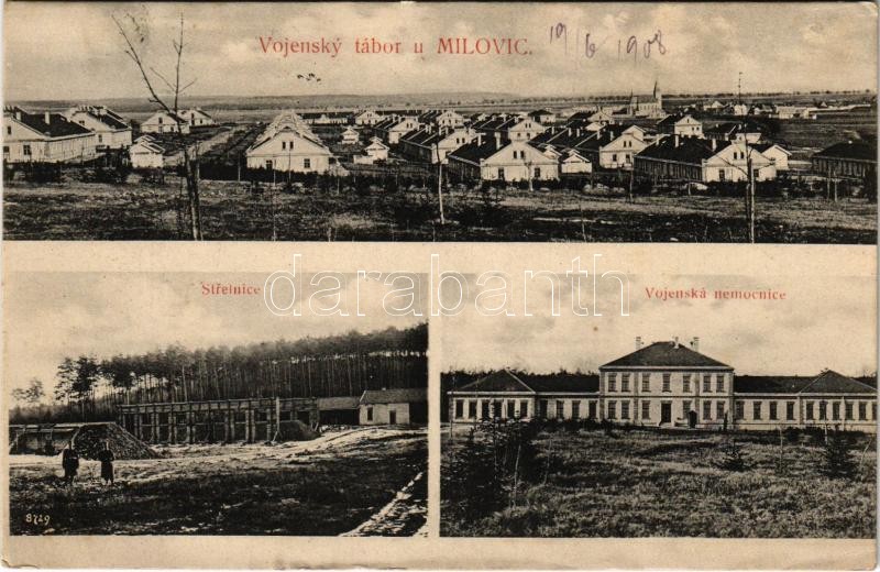 1908 Milovice, Vojensky tábor, Strelnice, Vojensá nemocnice / military... https://www.darabanth.com/de/409-Fernauktion/409.0/Ansichtskarten/Tschechische-Republik~1000022/1908-Milovice-Vojensky-tabor-Strelnice-Vojensa-nemocnice-military-camp-barracks-and-hospital~II2538458