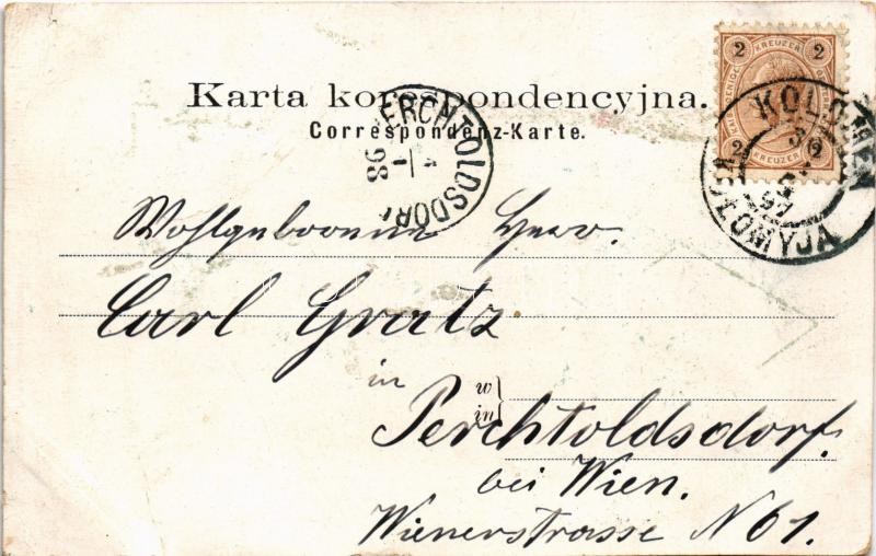 1897 (Vorläufer) Kolomyia, Kolomyja, Kolomyya, Kolomea; Rynek i Ratusz, Sokol, Kasa Oszgz, cerkiew / square, town hall, villa, church. Szymona Sennensiba Art Nouveau, floral, litho (small tear)