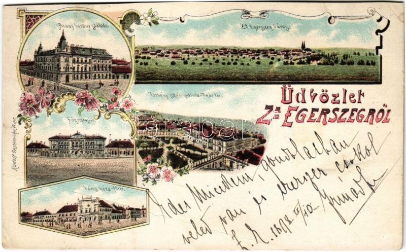 Beschreibung: 1898 (Vorläufer) Zalaegerszeg, Arany bárány szálloda, főgimnázium, Deák tér, Törvényszéki palota, Városháza, főtér. Rudolf Oesterreicher Art Nouveau, floral, litho (EB)