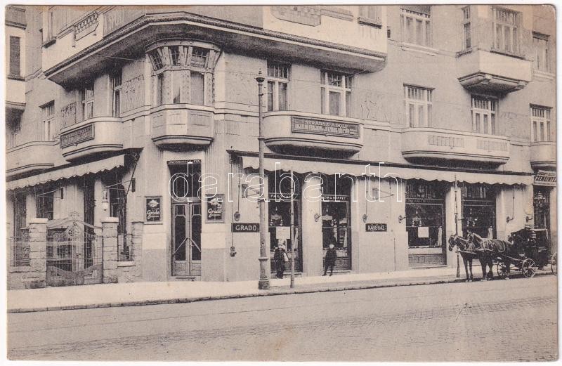 1913 Budapest XIV. Jakobovics és fia Gradó kávéháza, fagylalt, hideg büffet, Strausz Adolf ingatlan, forgalmi és jelzálog kölcsön intézete, zeneintézet. Aréna út 17. (Dózsa György út) (EK)