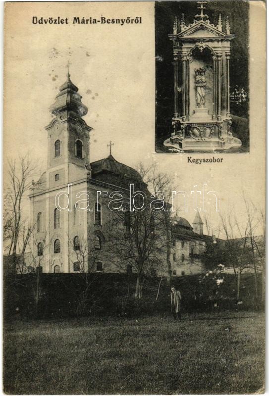 Beschreibung: 1913 Máriabesnyő (Gödöllő), Kegytemplom, kegyszobor. Trittner R. felvétele (ragasztónyom / glue marks)