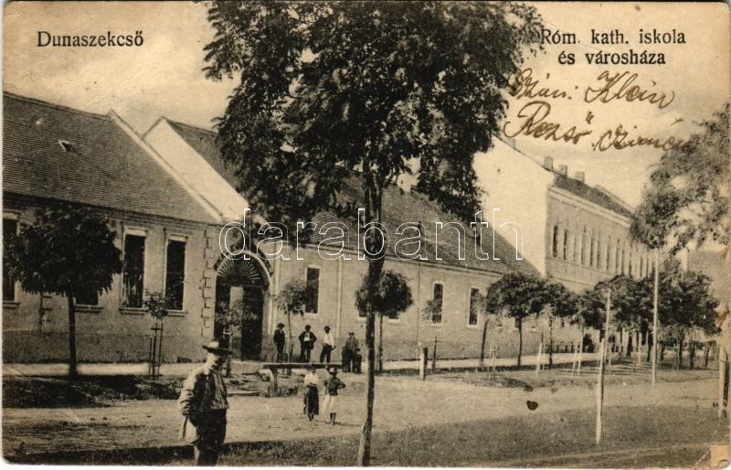 Beschreibung: Dunaszekcső, Római katolikus iskola és városháza. Balogh Pál kiadása (EB)
