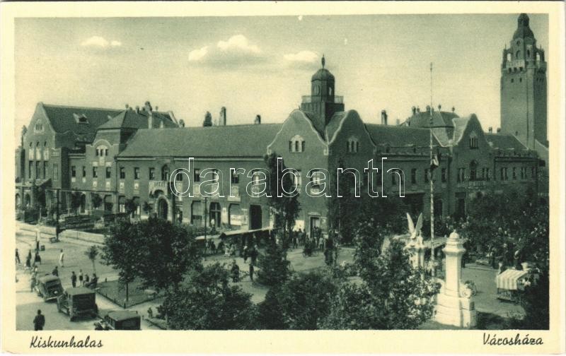 Beschreibung: Kiskunhalas, Városháza, Országzászló, automobil, piac. Kálmán Miksa kiadása