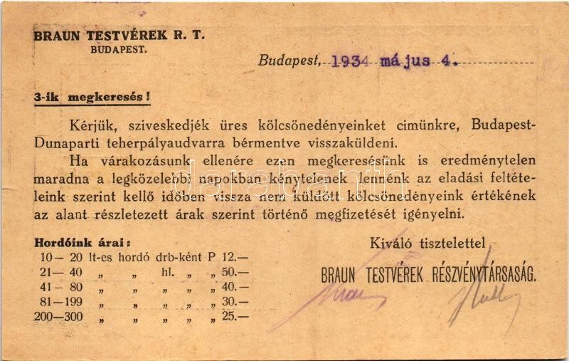 1934 Braun Testvérek Likőr és Konyakgyár reklámlapja. Hátoldalon megrendelőlap. Budapest VIII. Üllői út 60. / Hungarian Liqueur and Cognac Factory advertisement, order form on the backside