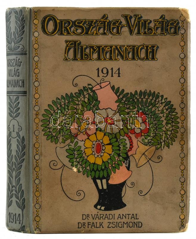 1914 Ország-Világ Almanach. 1914 - I. Szerk.: Váradi Antal, Falk Zsigmond. Bp., Országos Irodalmi Rt., 282+6 p. Deli A., Dománovits J., Gaiger M., Hein J., Jobbágyi M., Károly E., Lénárd I., Mund H., N. Feleky Gy., Palcsó D. és Palcsó K. festőművészek rajzaival. Kiadói aranyozott, festett, illusztrált félvászon-kötésben, névbejegyzéssel, kopott borítóval.