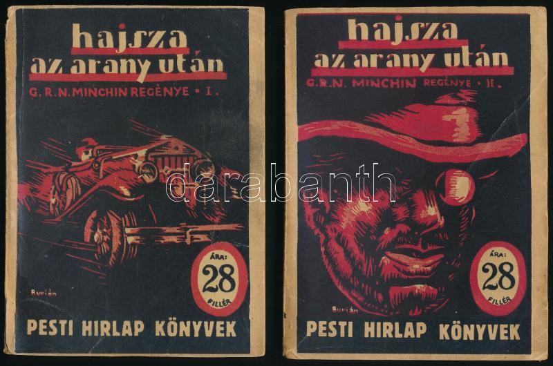 Hajsza az arany után. Regény I-II. kötet. Bp. 1931. Légrády. Pesti Hirlap Könyvek. a borítékot Burián László rajzolta. Kiadói papírkötésben, I. kötet gerince és hátsó borítója sérült, első néhány lapon jobb felső sarokban apró sérüléssel, II. kötetborítója és címlapja sérült.