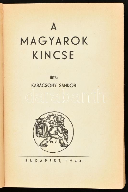 Karácsony Sándor: A magyarok kincse. Bp., 1944, Exodus. Kiadói papírkö... https://www.darabanth.com/de/409-Fernauktion/409.0/Bucher/Bucher-Andere-kuriositaten~2000023/Karacsony-Sandor-A-magyarok-kincse-Bp-1944-Exodus-Kiadoi-papirkotes-serult-gerinc-ko~II2505133