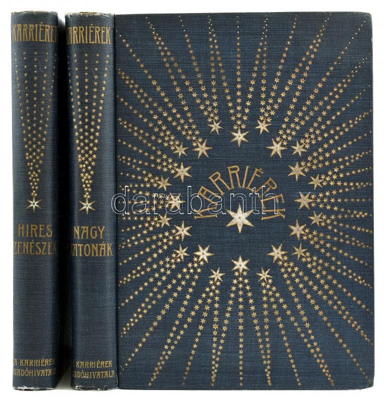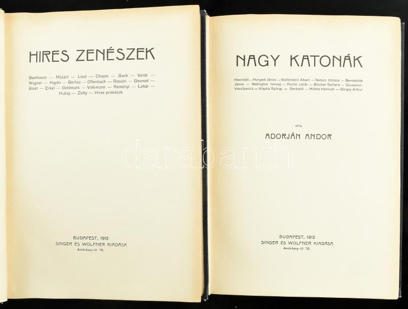 Karriérek sorozat 2 kötete: Adorján Andor: Nagy katonák; Híres zenészek. Bp., 1912, Singer és Wolfner, 237+3 p., 219+4 p. Kiadói aranyozott egészvászon-kötés, a borítókon apró sérülésekkel.