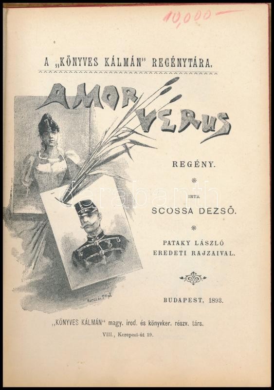 Scossa Dezső: Amor Verus. Pataky László eredeti rajzaival. "Könyves Kálmán" Regénytára. Bp., 1893, "Könyves Kálmán", 159 p. Kiadói aranyozott, festett egészvászon-kötés, Leszik-kötés, festett lapélekkel, foltos, kissé kopott borítóval, az elülső szennylapon címke nyomokkal.