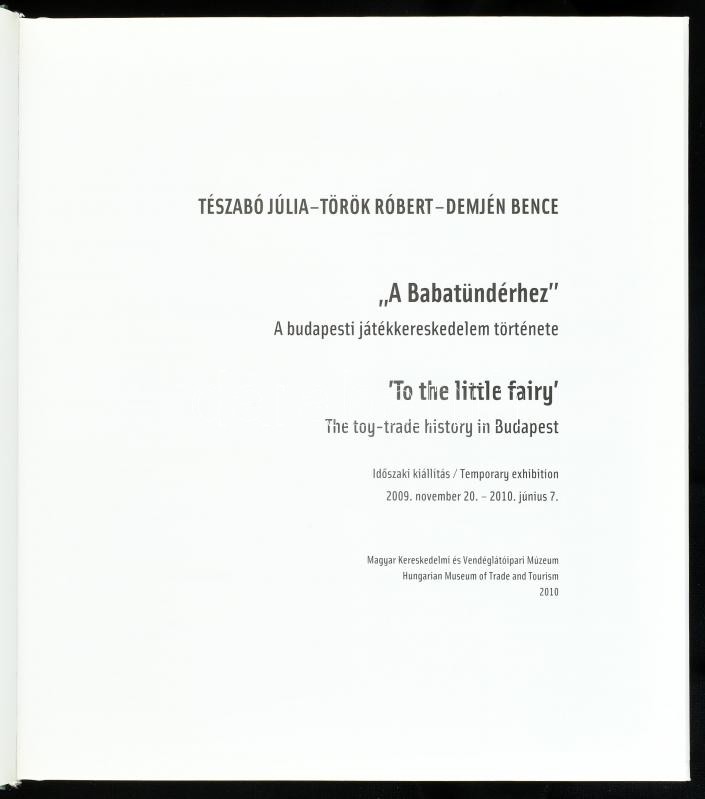 Tészabó Júlia, Török Róbert, Demjén Bence: "A Babatündérhez". A budapesti játékkereskedelem története. 'To the little fairy'. The toy-trade history in Budapest. Bp., 2010, Magyar Kereskedelmi és Vendéglátóipari Múzeum. Gazdag képanyaggal illusztrálva. Kiadói kartonált papírkötés, kissé kopott borítóval, egyébként jó állapotban.