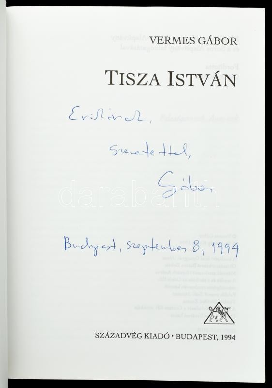 Vermes Gábor: Tisza István. Századvég biográfiák. A szerző által dedik... https://www.darabanth.com/de/409-Fernauktion/409.0/Bucher/Bucher-Geschichte~2000008/Vermes-Gabor-Tisza-Istvan-Szazadveg-biografiak-A-szerzo-altal-dedikalt-peldany-Bp-1~II2537595
