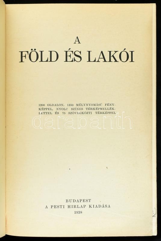 A Föld és lakói. 1200 oldalon, 1350 mélynyomású fényképpel, 8 színes térképmelléklettel, 75 szövegközti térképpel. A Pesti Hírlap Könyvtára. Bp., 1938, Pesti Hírlap. Trianon előtti és Csonka-Magyarország térképpel. Fekete-fehér fotókkal illusztrált. Kiadói díszes, aranyozott egészvászon-kötésben, a borítón kopásnyomokkal, a Trianon előtti és Csonka-Magyarország kijár.