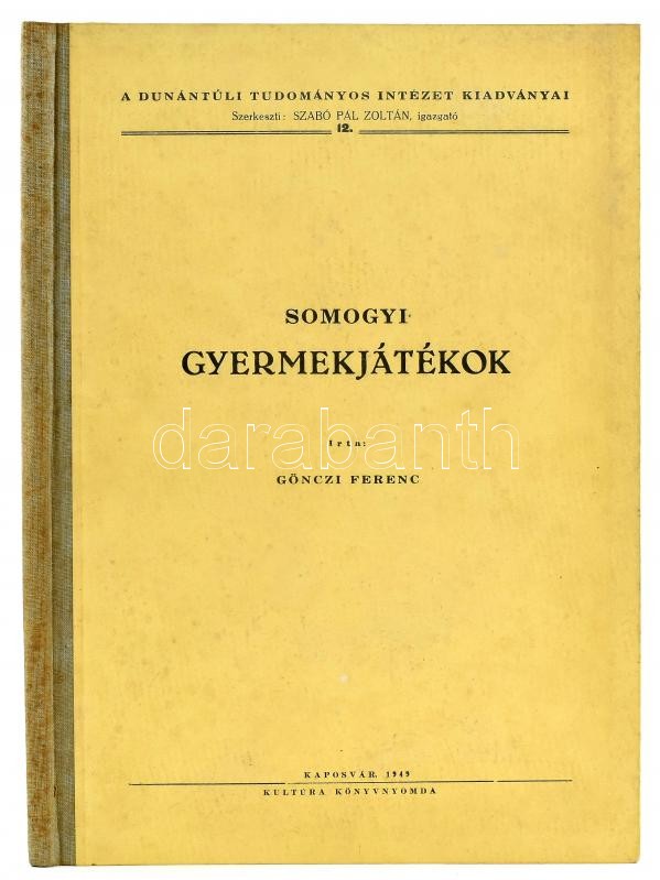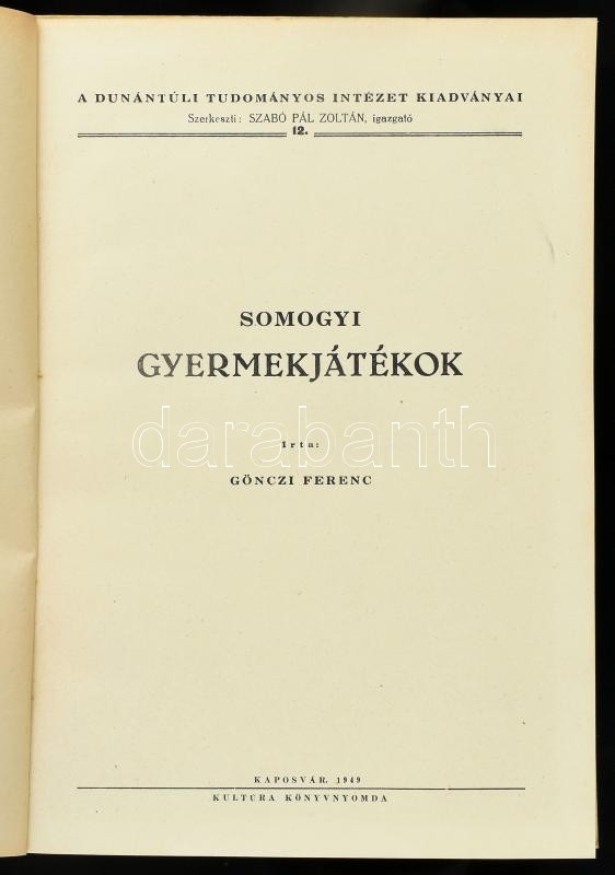 Gönczi Ferenc: Somogyi gyermekjátékok. A Dunántúli Tudományos Intézet Kiadványai 12. Kaposvár, 1949., Kultúra Könyvnyomda, 103 p. Kiadói félvászon-kötés, kissé kopott, kissé foltos borítóval, egy-két kissé foltos lappal.