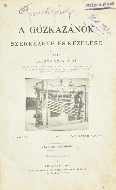 Jalsoviczky Géza: A gőzkazánok szerkezete és kezelése. I. köt. Bp., 1903., Műszaki, 8+322+2 p. Átkötött kopott egészvászon-kötés, kopott, foltos borítóval, pár lapon bejelöléssel, kissé foltos lapokkal, névbejegyzéssel, névbélyegzésekkel.