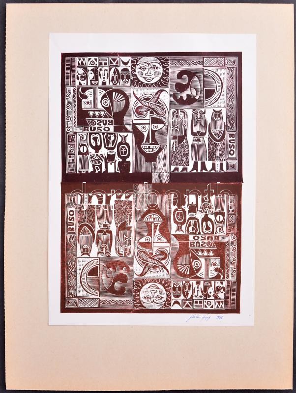 Farkas József (?-): Busó, 1970. Linómetszet, papír, jelzett, lap teteje papírra kasírozva, 27×18,5 cm. Soós Imre (1921-2013) műgyűjtő, művészeti író, a Kisgrafika folyóirat szerkesztője, a Magyar Nemzeti Galéria Baráti Köre alelnökének hagyatékából.