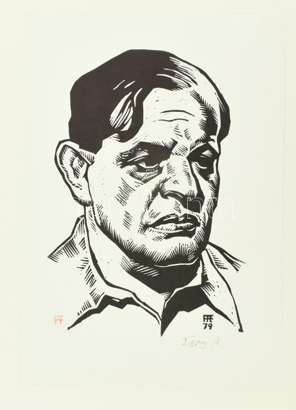 Fery Antal (1908-1994): Karinthy Frigyes portréja. Fametszet, papír, utólagos (?) jelzéssel, papírlapra kasírozva. 29×21 cm. Soós Imre (1921-2013), műgyűjtő, művészeti író, a Kisgrafika folyóirat szerkesztője, a Magyar Nemzeti Galéria Baráti Köre alelnökének hagyatékából.