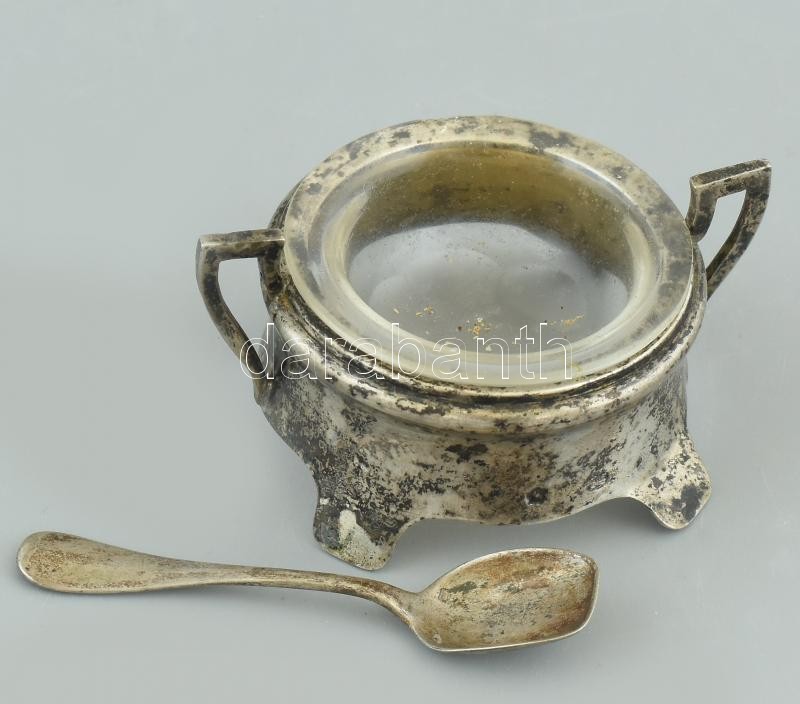 Ezüst (Ag) Art Deco fűszertartó üvegbetéttel és kiskanállal. Jelzett, ... https://www.darabanth.com/de/409-Fernauktion/409.0/Juwelen/Juwelen~2000024/Ezust-Ag-Art-Deco-fuszertarto-uvegbetettel-es-kiskanallal-Jelzett-kopott-d-8cm-netto~II2543302