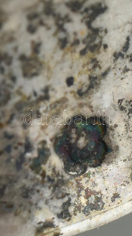 Beschreibung: Ezüst (Ag) Art Deco fűszertartó üvegbetéttel és kiskanállal. Jelzett, kopott, d: 8cm, nettó: 41g