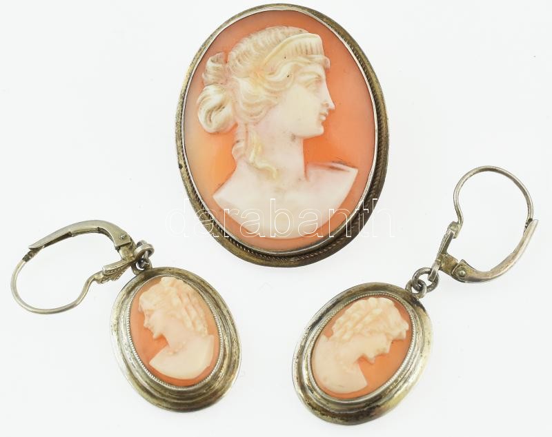 Ezüst (Ag) fülbevalópár és medál, kámea berakással, kopott, jelzett, b... https://www.darabanth.com/de/409-Fernauktion/409.0/Juwelen/Juwelen~2000024/Ezust-Ag-fulbevalopar-es-medal-kamea-berakassal-kopott-jelzett-brutto11g~II2533365