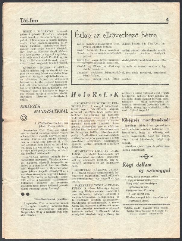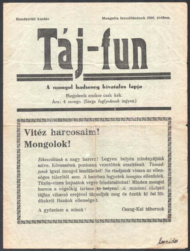 cca 1943 Táj-fun, a mongol hadsereg hivatalos lapja, tréfás kiadvány https://www.darabanth.com/de/409-Fernauktion/409.0/Kunst-Dokumente-andere-Sammelgebiete/Drucksachen~2000003/cca-1943-Taj-fun-a-mongol-hadsereg-hivatalos-lapja-trefas-kiadvany~II2530925