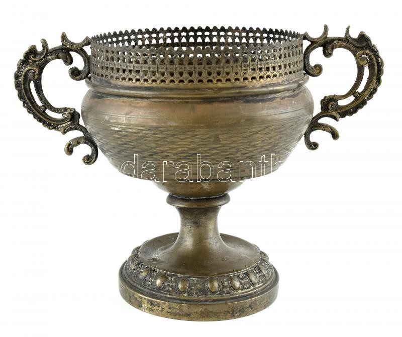 Beschreibung: Art deco stílusú alpakka kínáló, jelzés nélkül, két oldalán fülekkel, tetején áttört mintával, kissé ferde, m: 13,5 cm