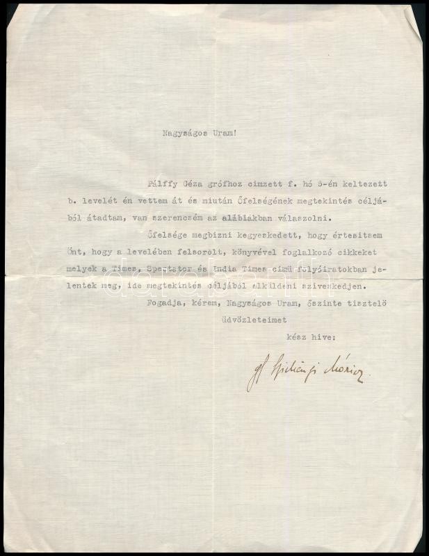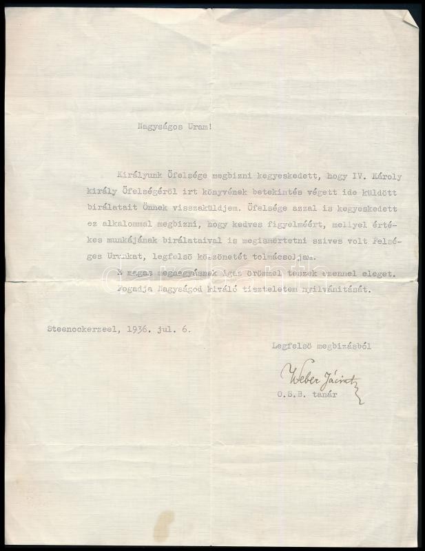 1936 gr. Széchenyi Móricz és Weber Jácint. IV, Károly titkárainak autográf aláírással ellátott levele Balassa Imre írónak A magyar királytragédia. IV. Károly; Világirodalom, Bp., 1925 c. könyve kapcsán a világsajtóban megjelent reagálásokról, melyben Zita királyné üzenetét tolmácsolják