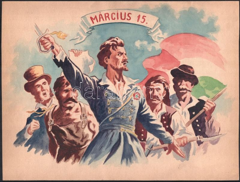 Beschreibung: cca 1947-1950 Március 15-i szocreál ünnepi plakátterv az elszánt népvezér Petőfivel, akvarell, jó állapotban, 29,5×38,5 cm