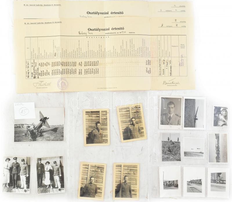 Beschreibung: cca 1940 A hősi halált halt repülő százados Verőczy imre fotóhagyatéka 15 db + 2 db Ludovika osztályozási értesítő