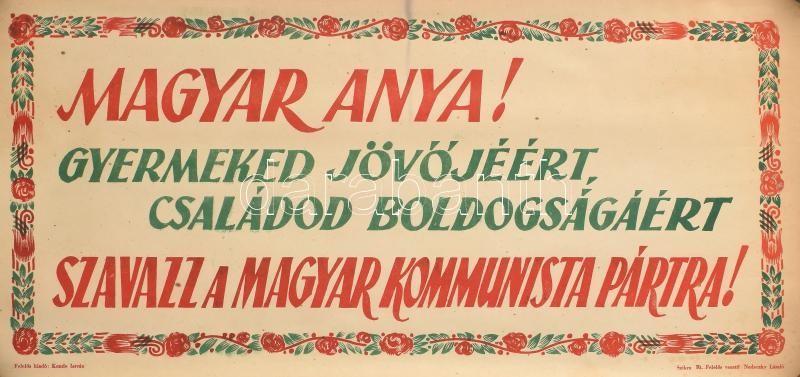 1947 Magyar Anya! Gyermeked jövőjéért, családod boldogságáért szavazz ... https://www.darabanth.com/de/409-Fernauktion/409.0/Kunst-Dokumente-andere-Sammelgebiete/Plakat~2000004/1947-Magyar-Anya-Gyermeked-jovojeert-csaladod-boldogsagaert-szavazz-a-Magyar-Kommunista-PC3~II2540402