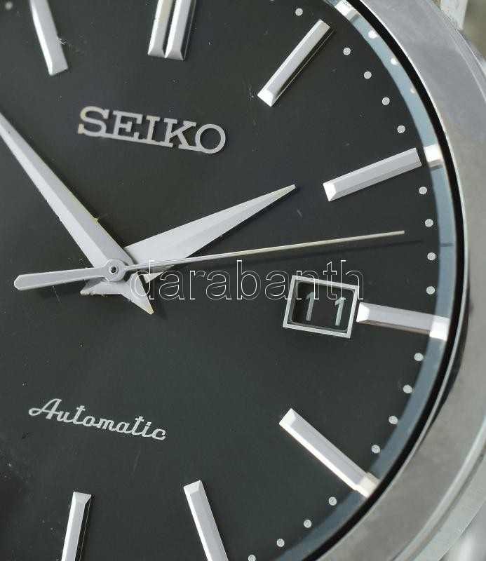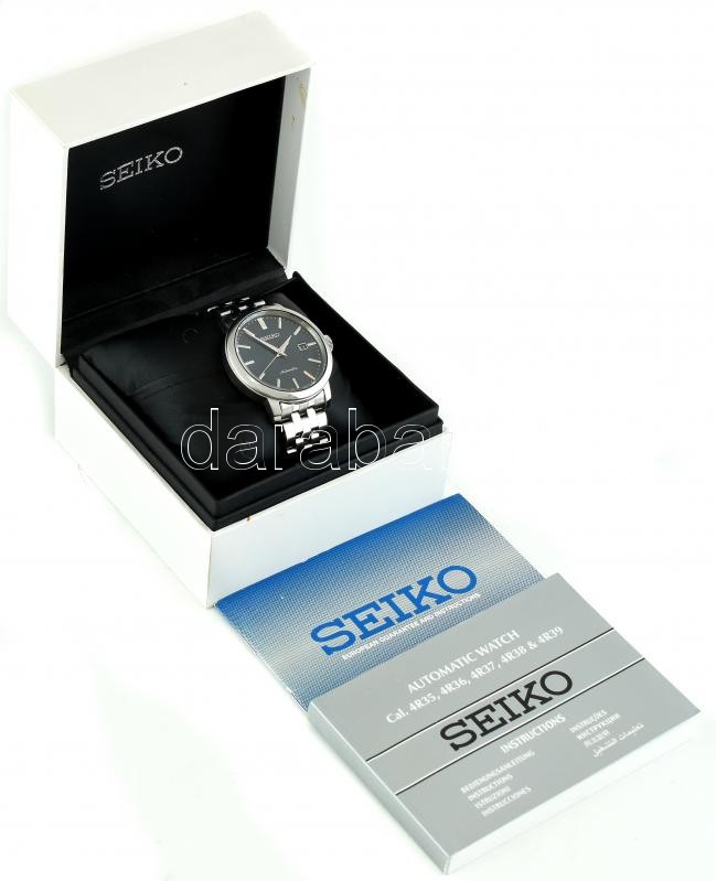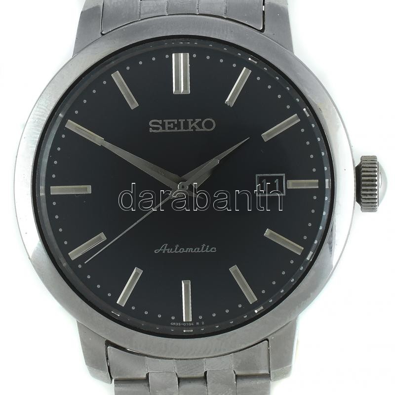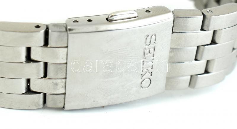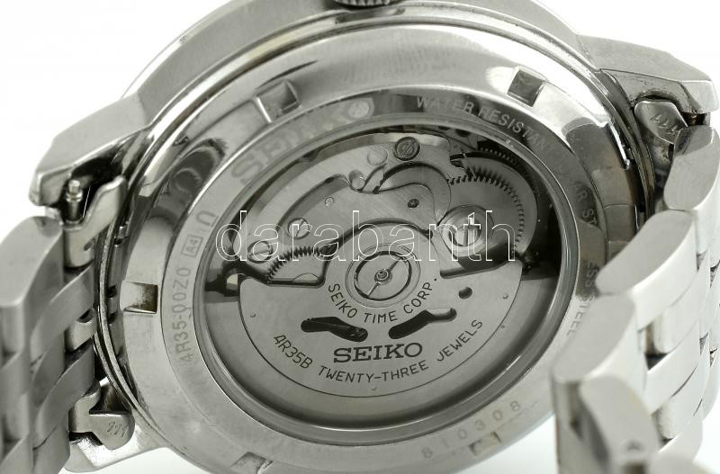 Seiko 23 köves automata óra, koronáról is húzható 4R35-ös automata szerkezettel, cca. 41 óra járástartalékkal, zafír óraüveg (apró karcok), rozsdamentes acél tok-és szíj, 10 ATM / 100M vízállóság, dátumjelző, d:40mm, tökéletesen működik, eredeti dobozában, papírokkal.