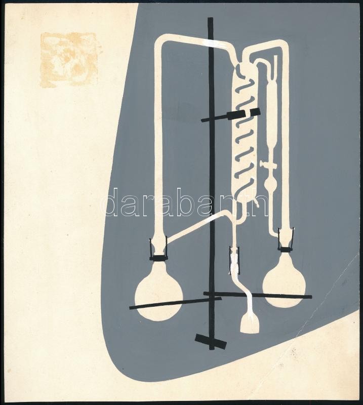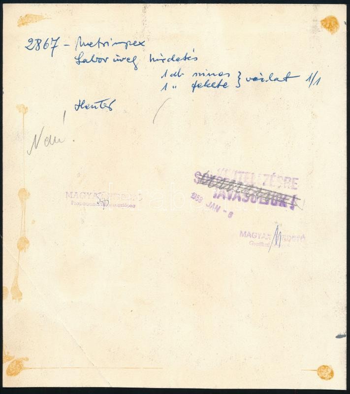 Henter János (?-): Metrimpex labor üveg hirdetés terve, 1959 körül. Tempera, papír. Hátoldalán jelzett és feliratozott, valamint Magyar Hirdető Grafikai lektorátus és propagandaszerkesztőség bélyegzőkkel, ugyancsak kivitelezésre javasoljuk ls dátum bélyegzővel. Jobb alsó sarkában törésnyommal, bal felső sarkában kissé foltos. 23x21 cm.