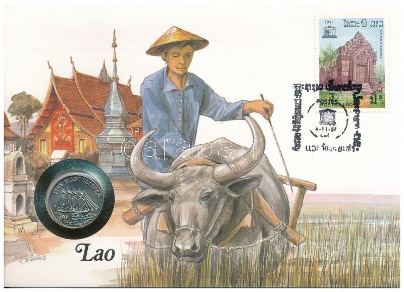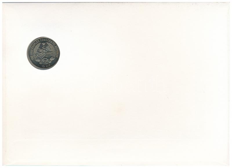 Laosz 1988. 10K Cu-Ni borítékban, bélyegzéssel, német nyelvű leírással T:1 Lao 1988. 10 Kip Cu-Ni "Five-masted Clipper" in envelope with stamp and cancellation and german-language description C:UNC