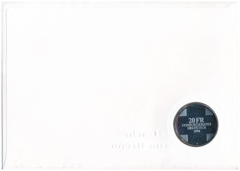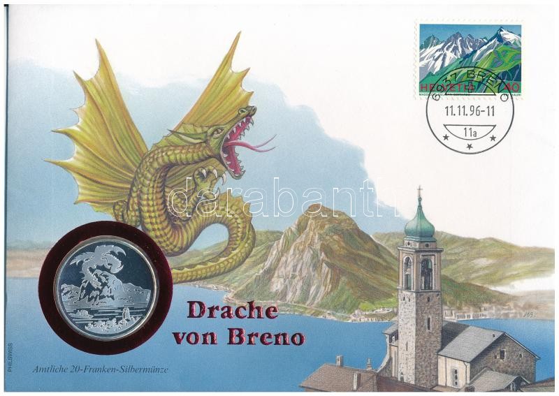 Svájc 1996B 20Fr Ag "A breno-i sárkány" érmés borítékban, bélyeggel, bélyegzéssel, német nyelvű leírással T:PP patina Switzerland 1996B 20 Francs Ag "Mythological Dragon of Breno" envelope with stamp and cancellation, with German language description sheet C:PP patina Krause KM#77