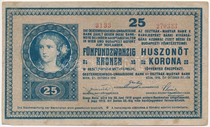 1918. 25K "3129" 3mm, hullámos hátlap T:III kis beszakadás, ... https://www.darabanth.com/de/409-Fernauktion/409.0/Numismatik/Ungarische-Banknoten~2500007/1918-25K-3129-3mm-hullamos-hatlap-TIII-kis-beszakadas-folt-Adamo-K223~II2535400
