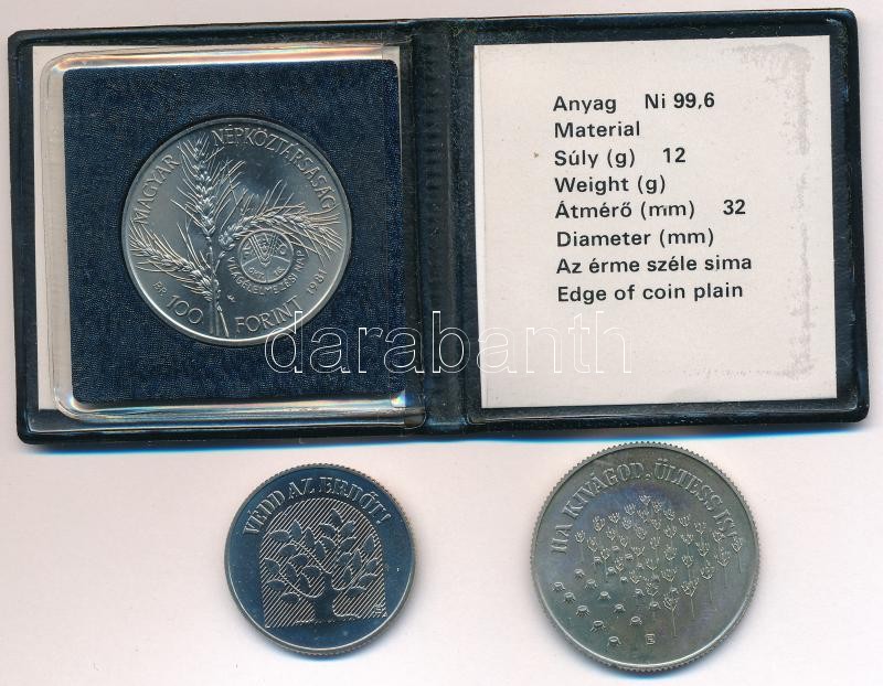 Beschreibung: 1981. 100Ft Ni "FAO I. - Világélelmezési nap" fekete műbőr tokban, tanúsítvánnyal + 1984. 20Ft Cu-Ni "FAO - Védd az erdőt" + 100Ft Cu-Ni "FAO - Ha kivágod, ültess is" T:BU,1- Adamo EM66, EM80, EM81