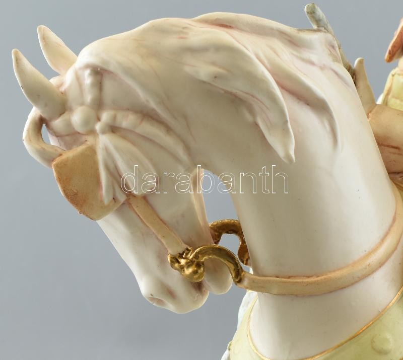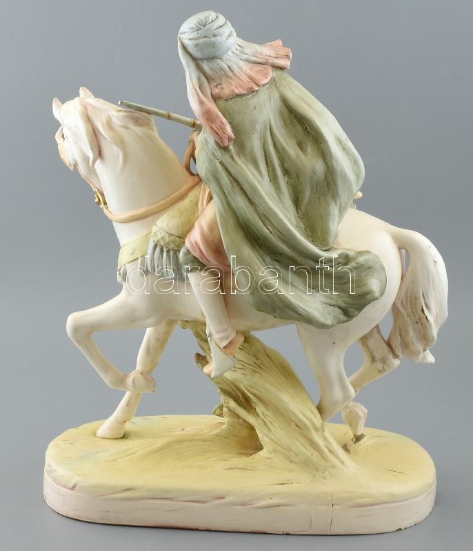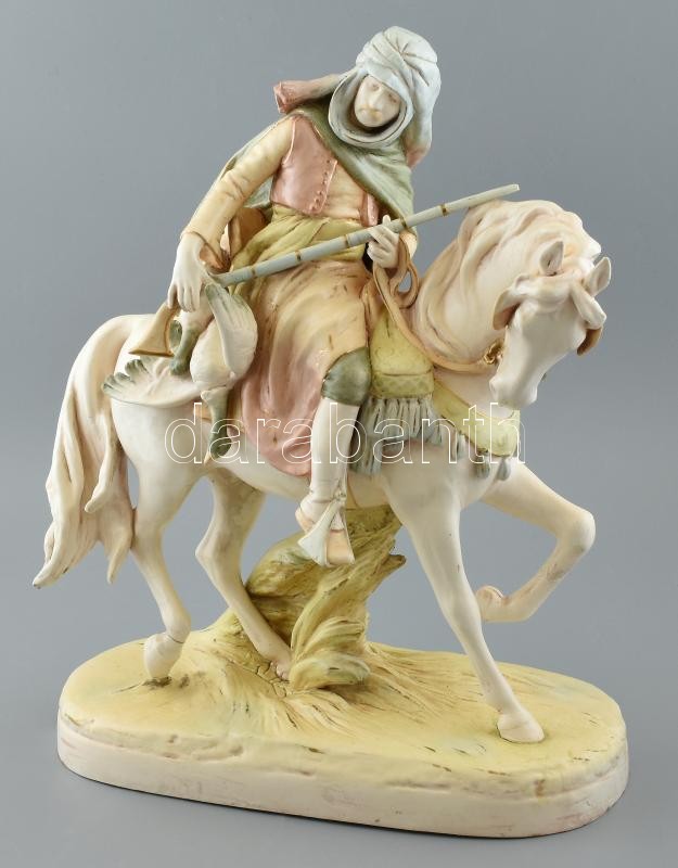 Royal Dux: Arab vadász. Színesen festett aranyozott fajansz. Kopott, restaurált, sérült. Jelzés nélkül. 1900 körül. Formaszám: 11775. 40x18x48cm (CSAK SZEMÉLYES ÁTVÉTEL)