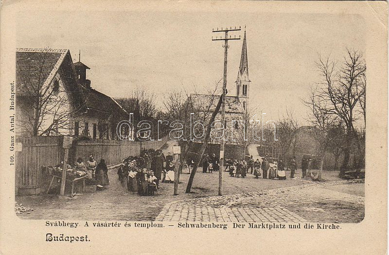 Budapest Svábhegy Vásártér és templom, Ganz Antal kisdása https://www.darabanth.com/de/41-Fernauktion/41.0/Ansichtskarten/~171/Budapest-Svabhegy-Vasarter-es-templom-Ganz-Antal-kisdasa~II79580