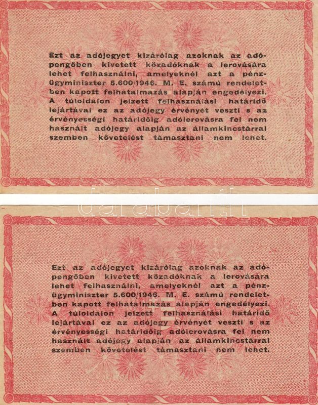 Beschreibung: 1946. 1000.000Adóp. (2x) 6 jegyű sorszámmal erősen elcsúszott (le és fel) számozással, vágási eltérések, hátlapi fordított címerrel T:II