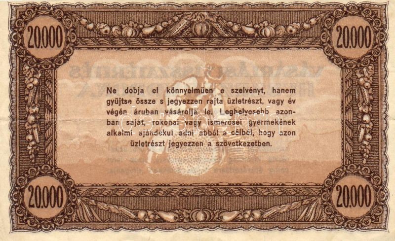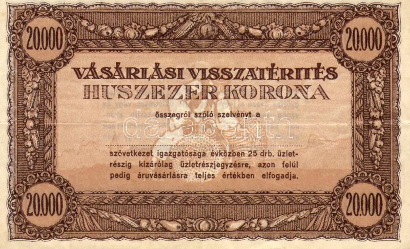 1920-as évek 20.000K vásárlási visszatérítés "...szövetkezeti üzletrés... https://www.darabanth.com/de/41-Fernauktion/41.0/Numismatik/~154/1920-as-evek-20000K-vasarlasi-visszaterites-szovetkezeti-uzletresz-TII~II79234
