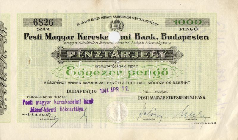 1944. Pesti Magyar Kereskedelmi Bank 1000P értékjegy, perforálva T:II https://www.darabanth.com/de/41-Fernauktion/41.0/Numismatik/~154/1944-Pesti-Magyar-Kereskedelmi-Bank-1000P-ertekjegy-perforalva-TII~II78452