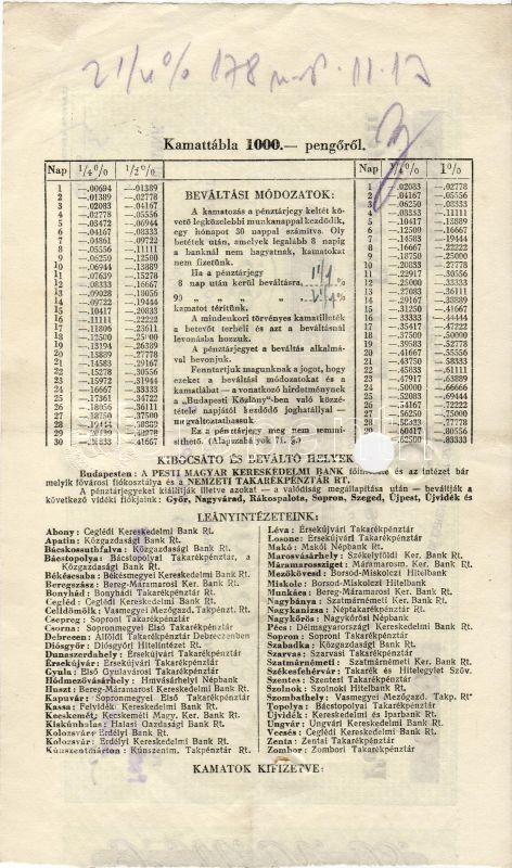 Beschreibung: 1944. Pesti Magyar Kereskedelmi Bank 1000P értékjegy, perforálva T:II