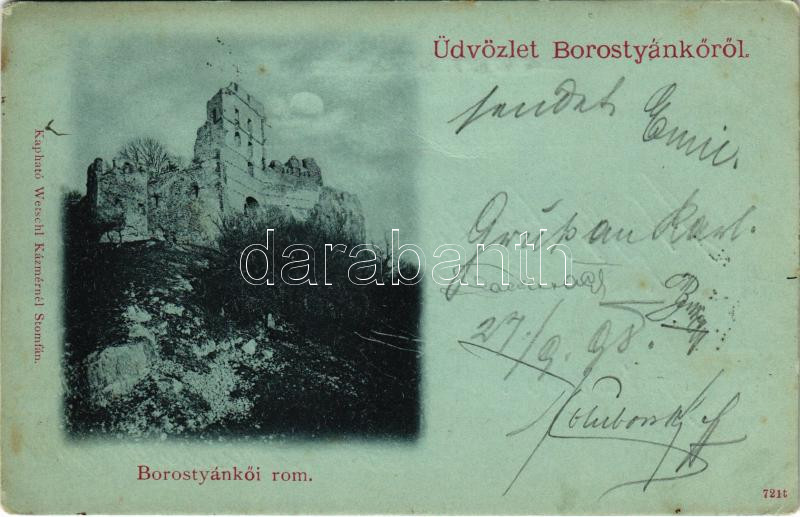 Beschreibung: 1898 (Vorläufer) Pozsonyborostyánkő, Stupavsky Podzámok, Borinka (Stomfa, Stupava); várrom este. Wetschl Kázmér kiadása / Schlossruine / castle ruins at night (EK)