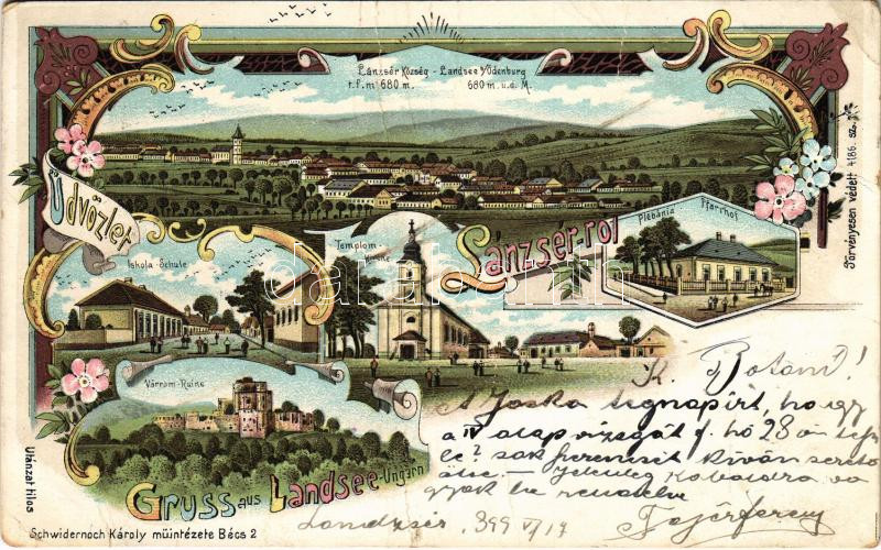 1899 (Vorläufer) Lánzsér, Lándzsér, Landsee (Sopronszentmárton); Plébánia, templom, iskola, várrom / Pfarrhof, Kirche, Schule, Schlossruine / rectory, church, school, castle ruins. Schwidernoch Károly Art Nouveau, floral, litho (fa)