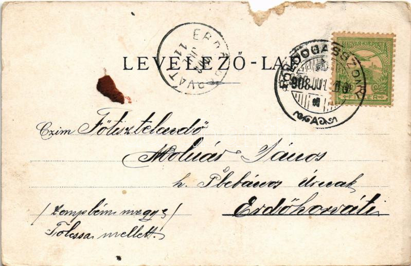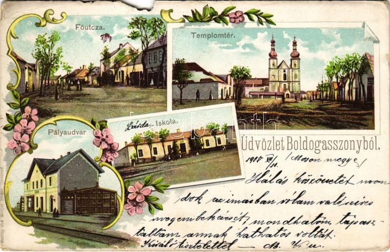 1908 Boldogasszony, Fertőboldogasszony, Frauenkirchen; Fő utca, Templom tér, pályaudvar, iskola / Hauptstrasse, Kirche Platz, Bahnhof, Schule / main street, church square, railway station, school. Art Nouveau, floral, litho (b)